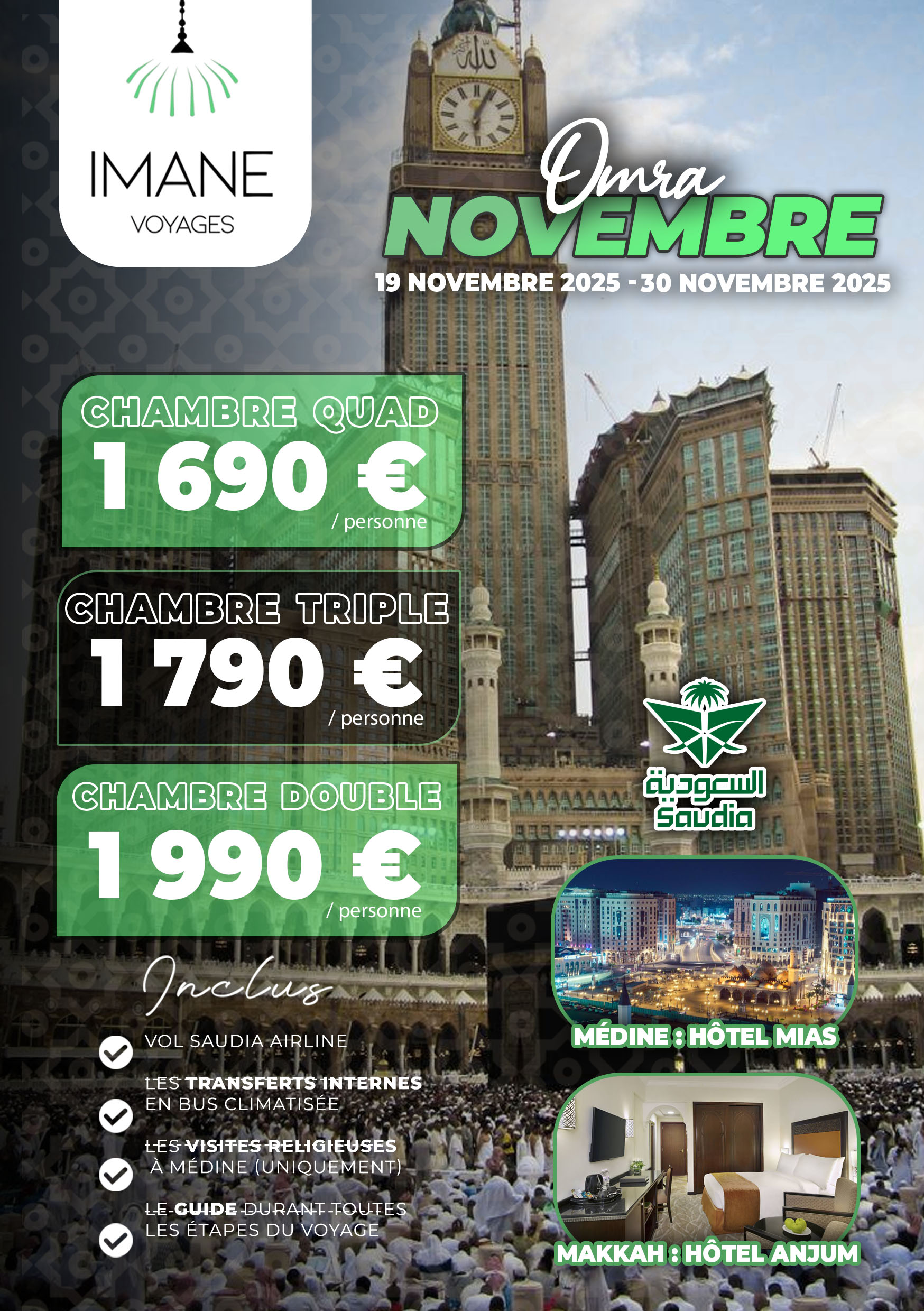 Après avoir terminé les formalités de douane à Médine, un bus privé (confort climatisé) vous transférera de l’aéroport de Médine vers votre hôtel à Médine.