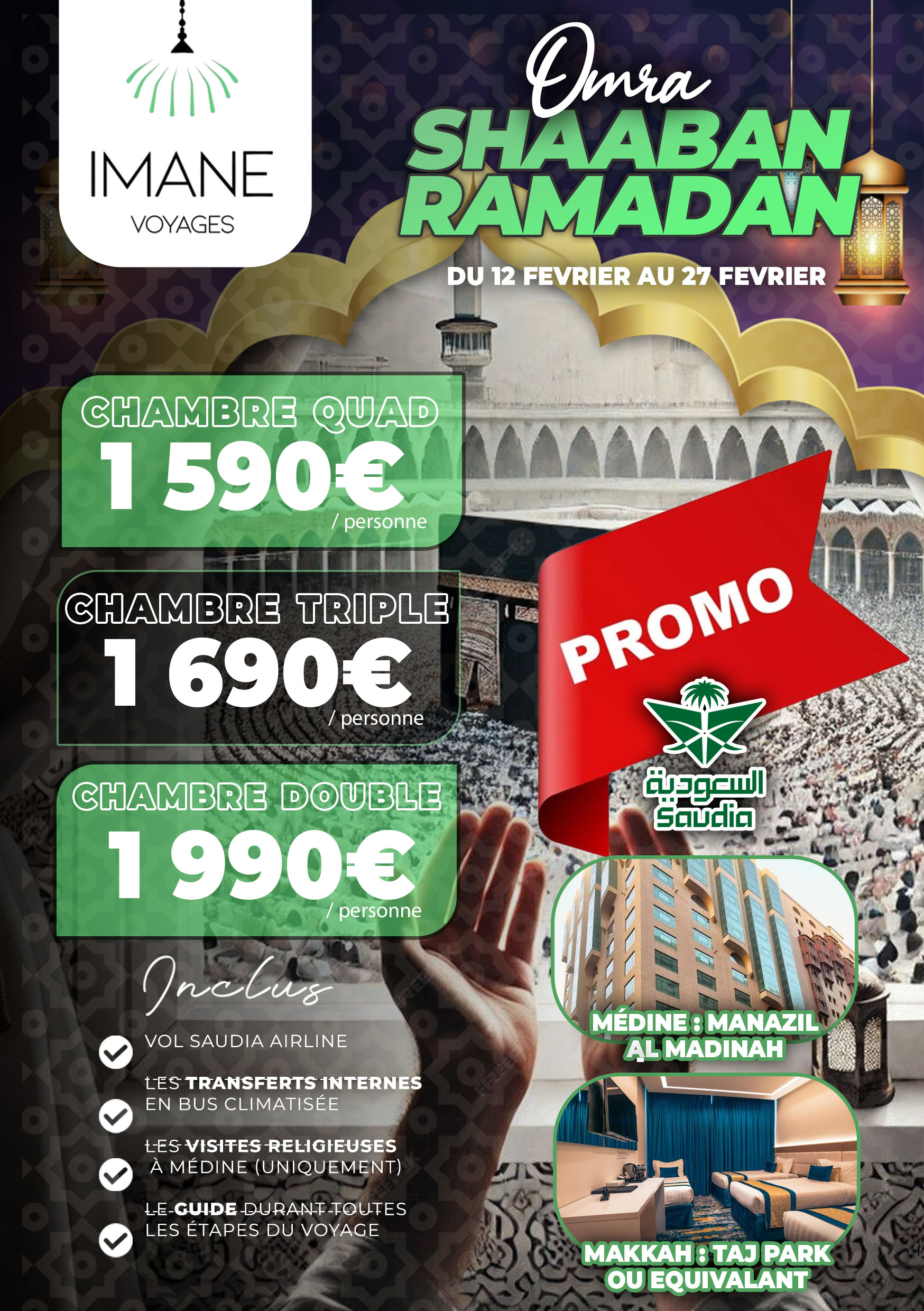 Après avoir terminé les formalités de douane à Médine, un bus privé (confort climatisé) vous transférera de l’aéroport de Médine vers votre hôtel à Médine.